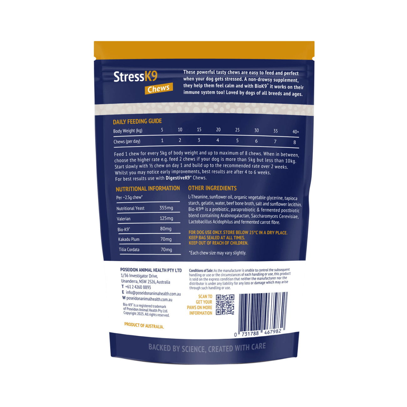 StressK9 contains our proprietary Bio-K9® gut health blend, along with calming botanicals such as Valerian, Tilia Cordata, Kakadu Plum, and L-Theanine. Nutritional Yeast, Essential Vitamins, and Amino Acids are included to help reduce stress and support immune health.